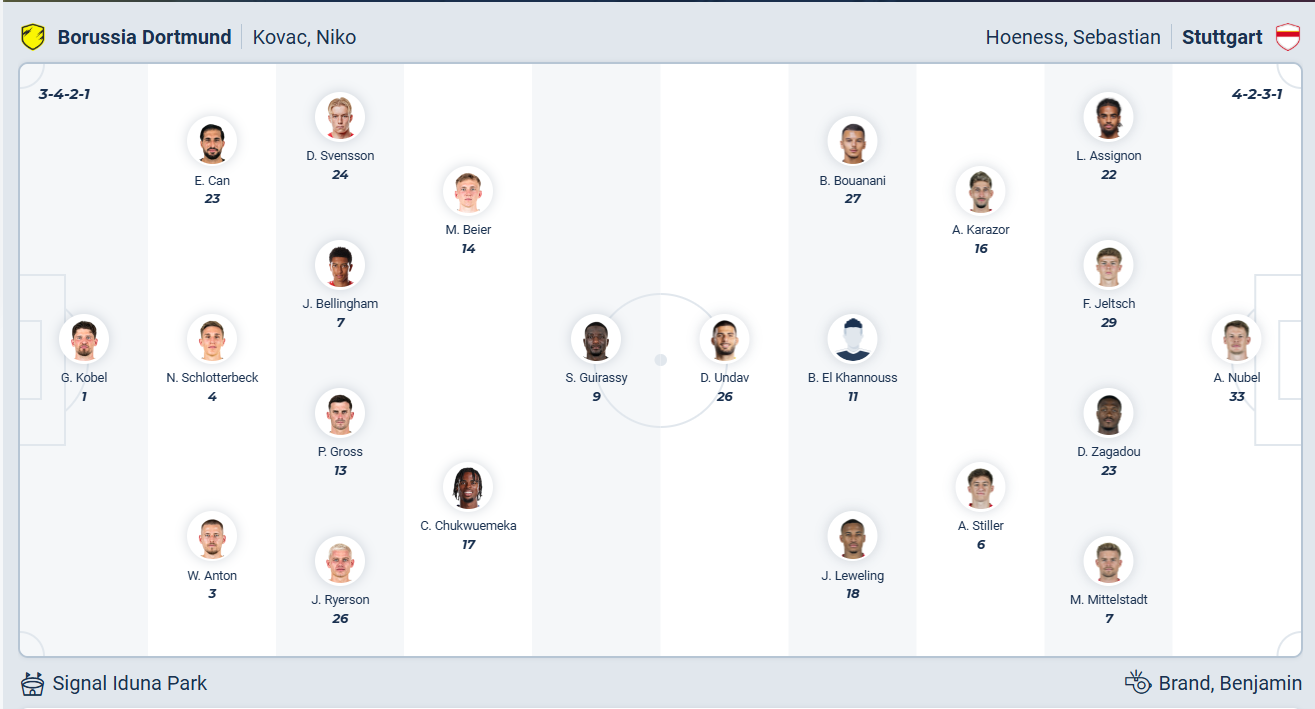 Stuttgart không phải đội bóng có tiềm lực mạnh của Bundesliga, họ chỉ đứng thứ 9 mùa trước nhưng vẫn có vé dự cup châu Âu nhờ chức vô địch cup Quốc gia. So với vị trí đó thì rõ ràng việc đang đứng thứ 4 ở thời điểm này là rất tích cực, với phong độ tốt thời gian gần đây thì thầy trò HLV Sebastian Hoeneß hoàn toàn tự tin vào một kết quả tốt ở vòng đấu tới để nuôi hy vọng giành vé dự cup Châu Âu mùa tới. Tuy nhiên rõ ràng chuyến làm khách trên sân của Dortmund rõ ràng không hề đơn giản, nhiều khả năng các cầu thủ Stuttgart chỉ có thể ra về với một kết quả hòa.